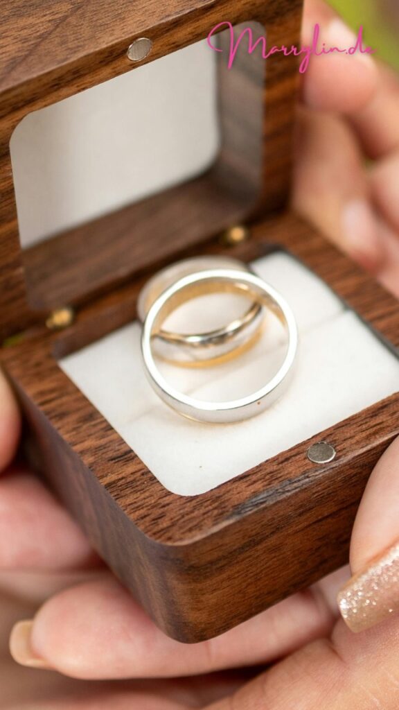 Ob klassisches Ringkissen, Holzbox, Glas-Cube, Muschelschale oder Moosnest – wichtig ist die Fixierung. Bänder, Einlagen mit Schlitz, kleine Magnete oder Stecknadeln (abgedeckt!) verhindern Herunterfallen. Wählt Material & Farbe passend zu eurem Konzept (z. B. Leinen & Eukalyptus, Acryl & Gold, Seegras & Natur). Für Outdoor-Trauungen: Deckel oder Tüllhaube gegen Wind. Für kirchliche Trauungen: dezent & feierlich; für freie Trauungen dürft ihr kreativer werden.