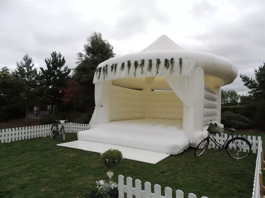 Ein absolutes Highlight ist außerdem die weiße Hochzeitshüpfburg – ein echter Eyecatcher für jede Feier. Anders als klassische, farbenfrohe Hüpfburgen fügt sich dieses Modell dezent und edel in euer Hochzeitsambiente ein. Sie ist nicht nur ein Magnet für Kinder, sondern auch ein beliebtes Fotomotiv für Gäste jeden Alters. Gerade bei Outdoor-Hochzeiten, Scheunenfesten oder freien Trauungen im Grünen entsteht so eine besondere Mischung aus Eleganz und Leichtigkeit.