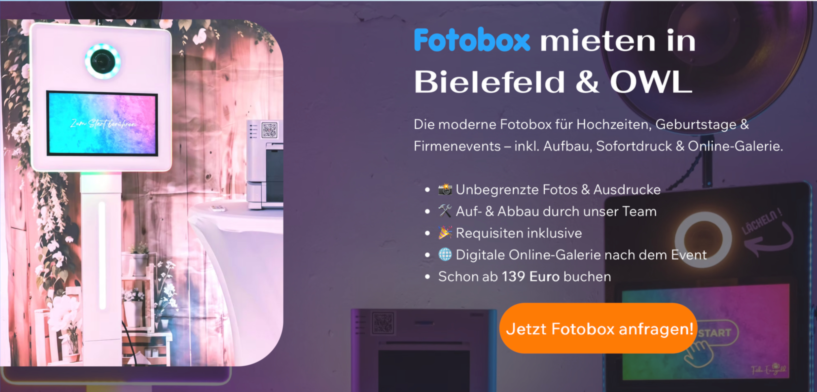 Professioneller Eventverleih für Fotoboxen, Hochzeitshüpfburgen, Audio Gästebuch und Fun-Food Produkten im Großraum Bielefeld. Lieferung und Aufbau möglich. Premium Fotobox ab 139 Euro, Hochzeitshüpfburg ab 190 Euro, Audio Gästebuch ab 49 Euro, u.v.m.
