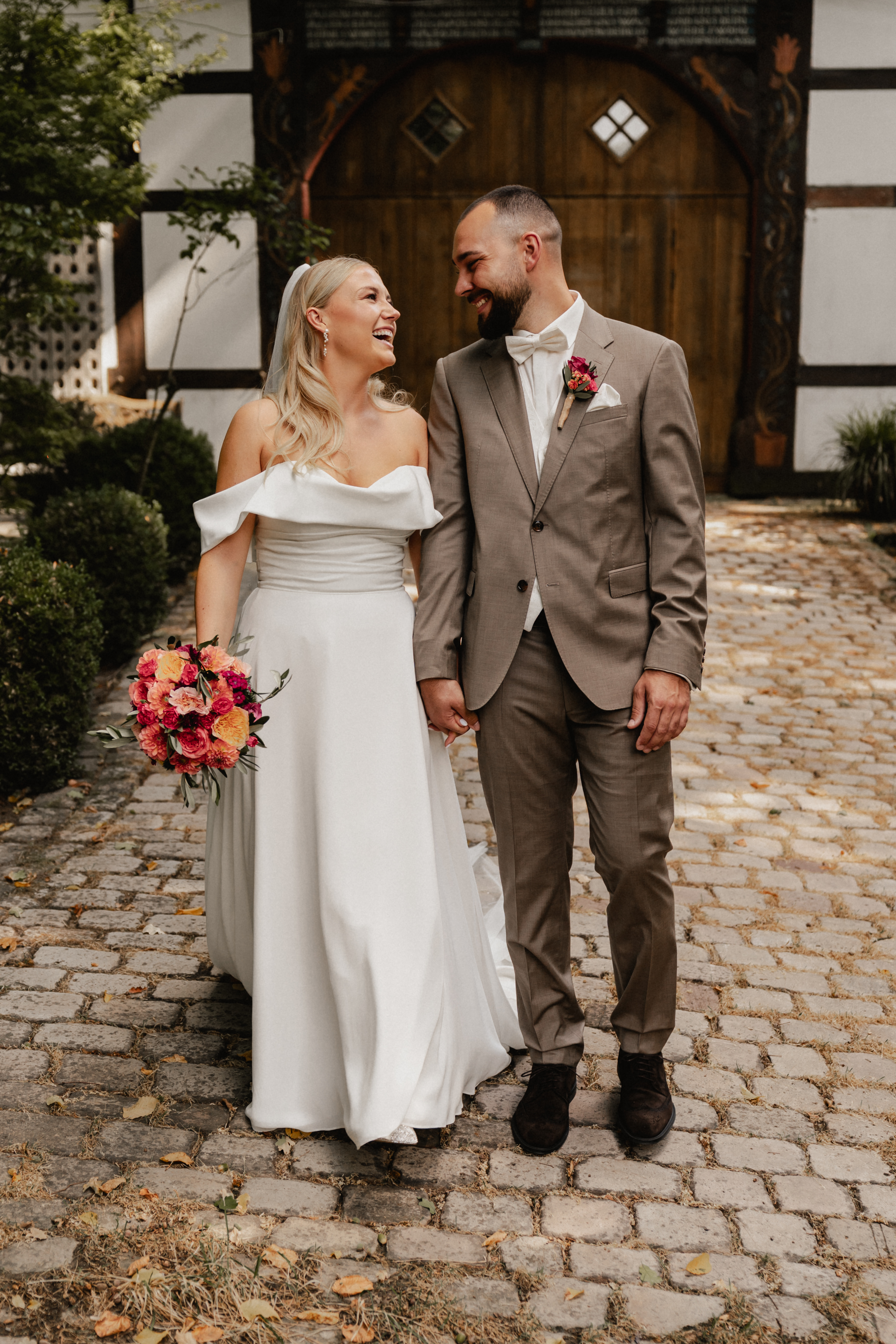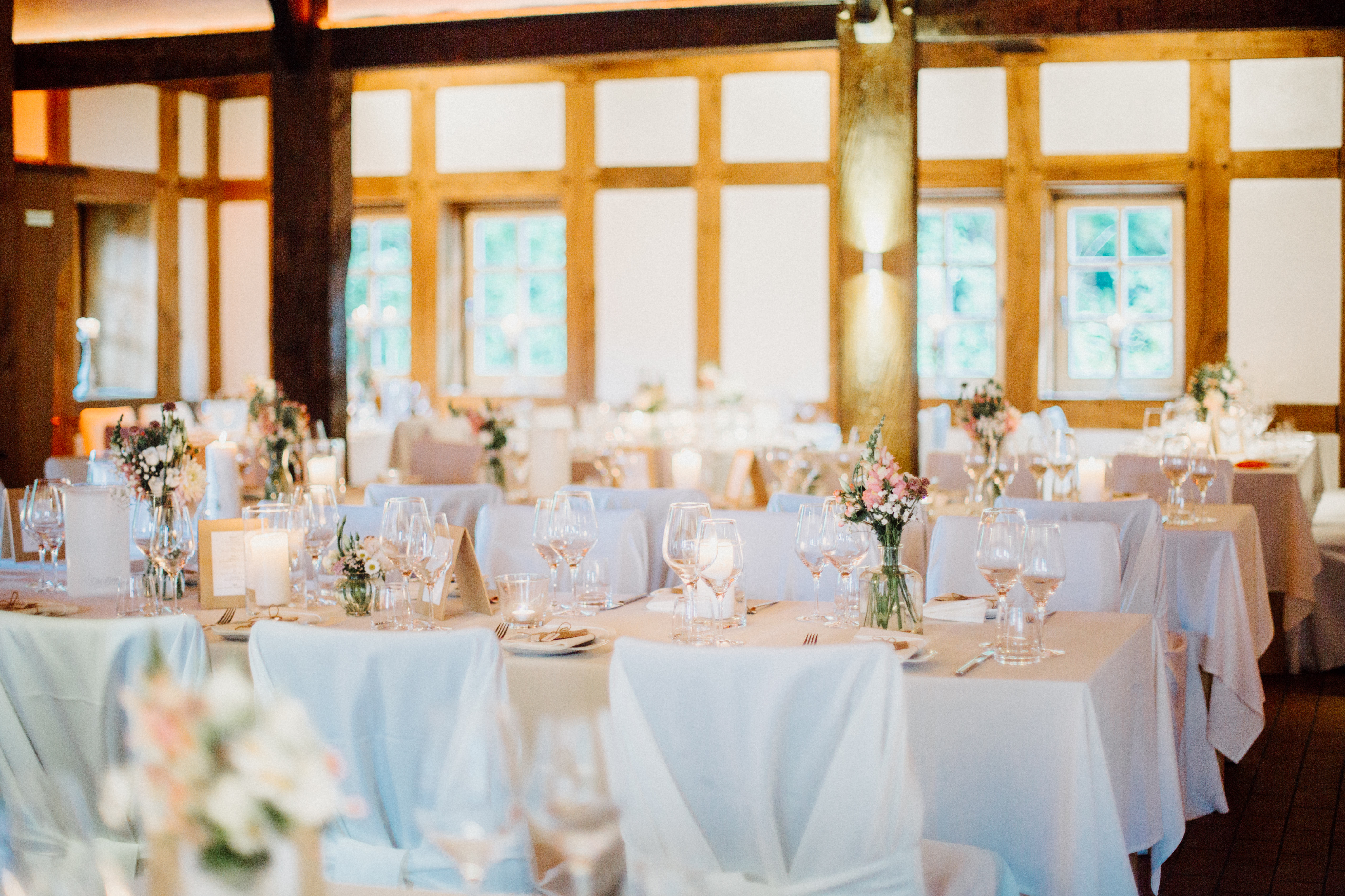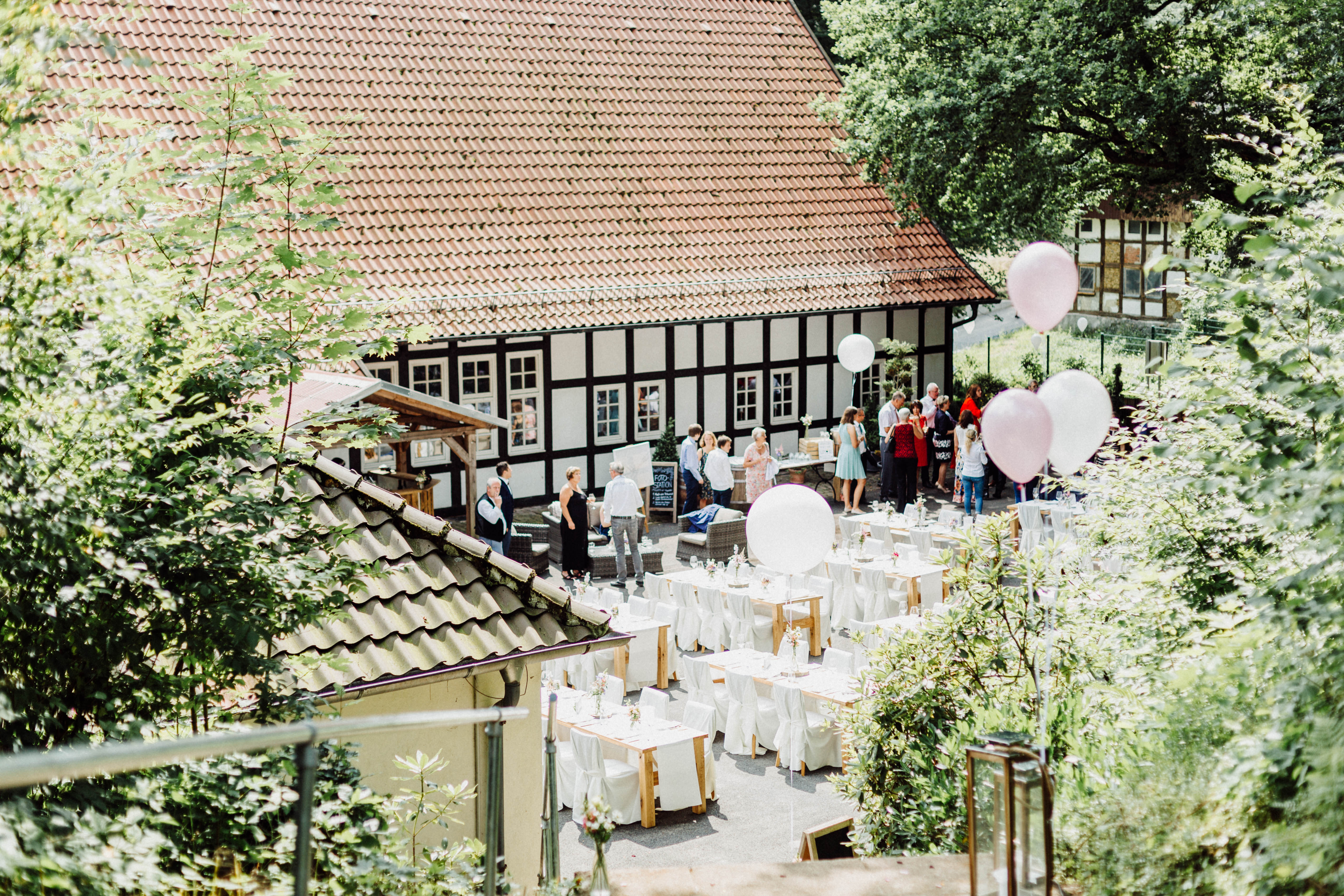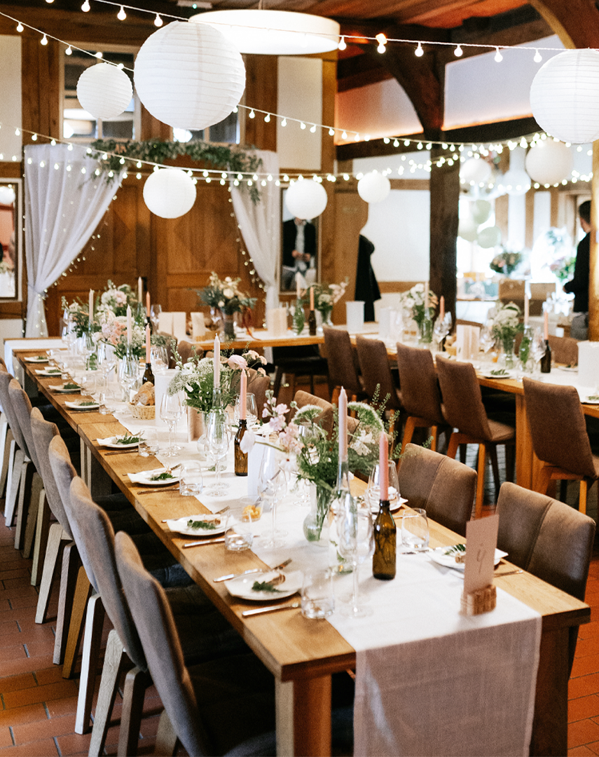 Im Anschluss wird im Fachwerkhaus gefeiert: gemütlich, stilvoll und mit viel Liebe zum Detail. Die Kombination aus Innen- und Außenbereich sorgt für eine entspannte und gleichzeitig festliche Stimmung – vom Empfang draußen bis zur Party am Abend.